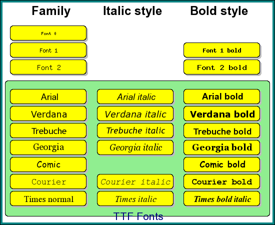 Please note that not all font families support all styles. The figure below illustrates each of the available font families and what styles you may use.