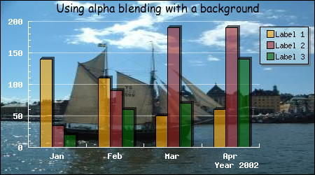 From version 1.10 JpGraph also supports the use of Alpha Blending together with GD2.x This lets you specify how much of the underlying color should be visible. You specify the amount of transparency for a color by adding an extra parameter to the color specification separated by an '@' (at) character.
