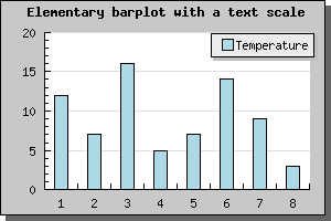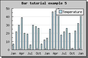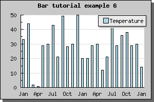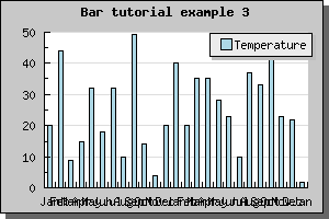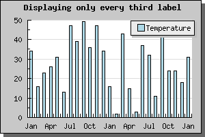 If we have an even larger data set it might not longer be meaningful to display all the tick marks since they would simple become to close. In JpGraph there is a possibility to specify that you only would like every n:th tick mark to be visible ( SetTextTickIntervall() ). For bar graphs using text scale however, that might not be such a good idea since the tick marks are between the bars and the labels centered under the bars. If we only were to display, say, every 3 tick mark it wouldn't look to good. Not that we can't do it, as the example below shows, but it just doesn't look very good.