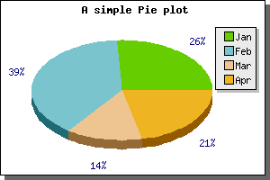 3D Pie plots have the same possibilities as the normal pie plots with the added twist of a 3:rd dimension. You can adjust the perspective angle with the method SetAngle() So for example to make the pie more "flat" you just set it to a smaller angle. Setting the perspective angle to 20 degrees in the previous example will give the following result.
