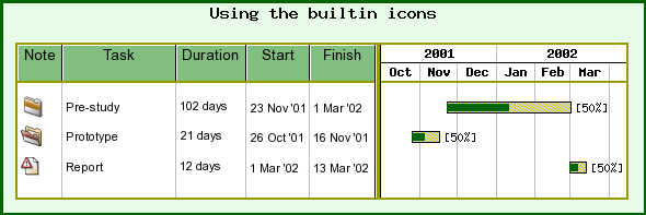 It is often of interest not only to show one title for a gantt bar but often one wants to show, title, start date, end date, duration or effort and so on. Up until now we have, to keep things simple only shown a single title for each activity. We will now show you how you can specify an arbitrary number of columns as titles for a Gantt chart as well as adding icons in the graph columns.