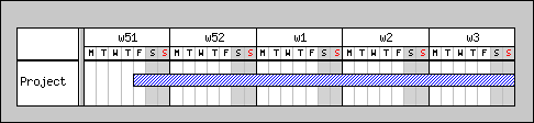 Time to show you an example of a Gantt chart and how easy it is to make one. Lets make it the simplest possible Gantt chart. One activity, named "Project", which lasts from "2001-11-01" to "2002-02-20".
